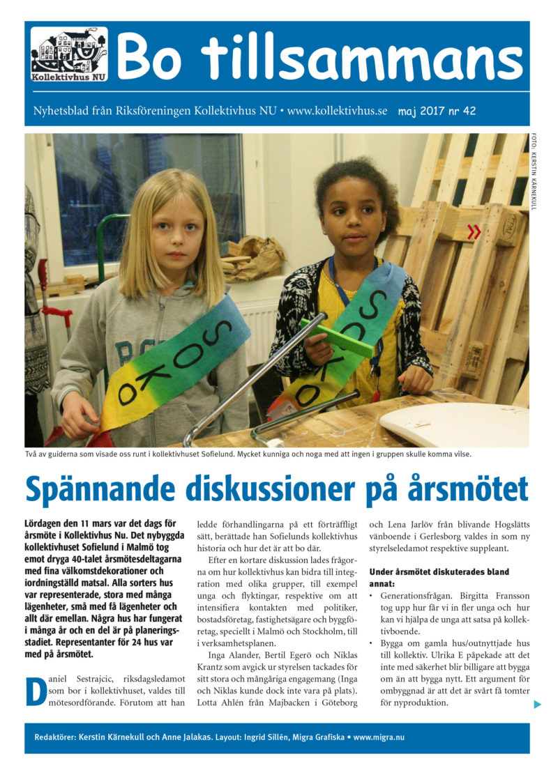 Islossning för kollektivhusen! Rudbeckia är på väg mot markanvisning i Uppsala, Hogslätt Vänboende har tagit första spadtaget och privata fastighetsägare vill samarbeta med startargrupper. Ett inspirerande årsmöte i kollektivhuset Sofielund i Malmö följd av en idébytardag i Slottet i Lund. Den spännande historien bakom kollektivhusen i Lund och vad en ”paraplyorganisation” av intresserade kan åstadkomma. Flera nya forskningsprojekt om kollektiva boendeformer. Allt detta och mer finns att läsa i Bo tillsammans nr 42.